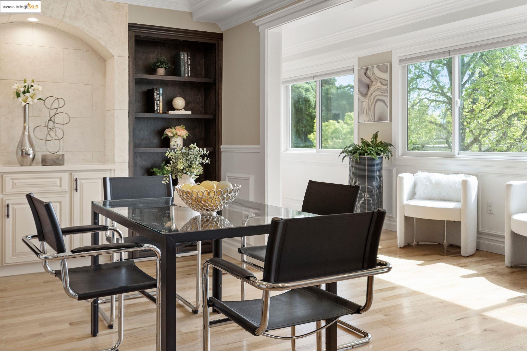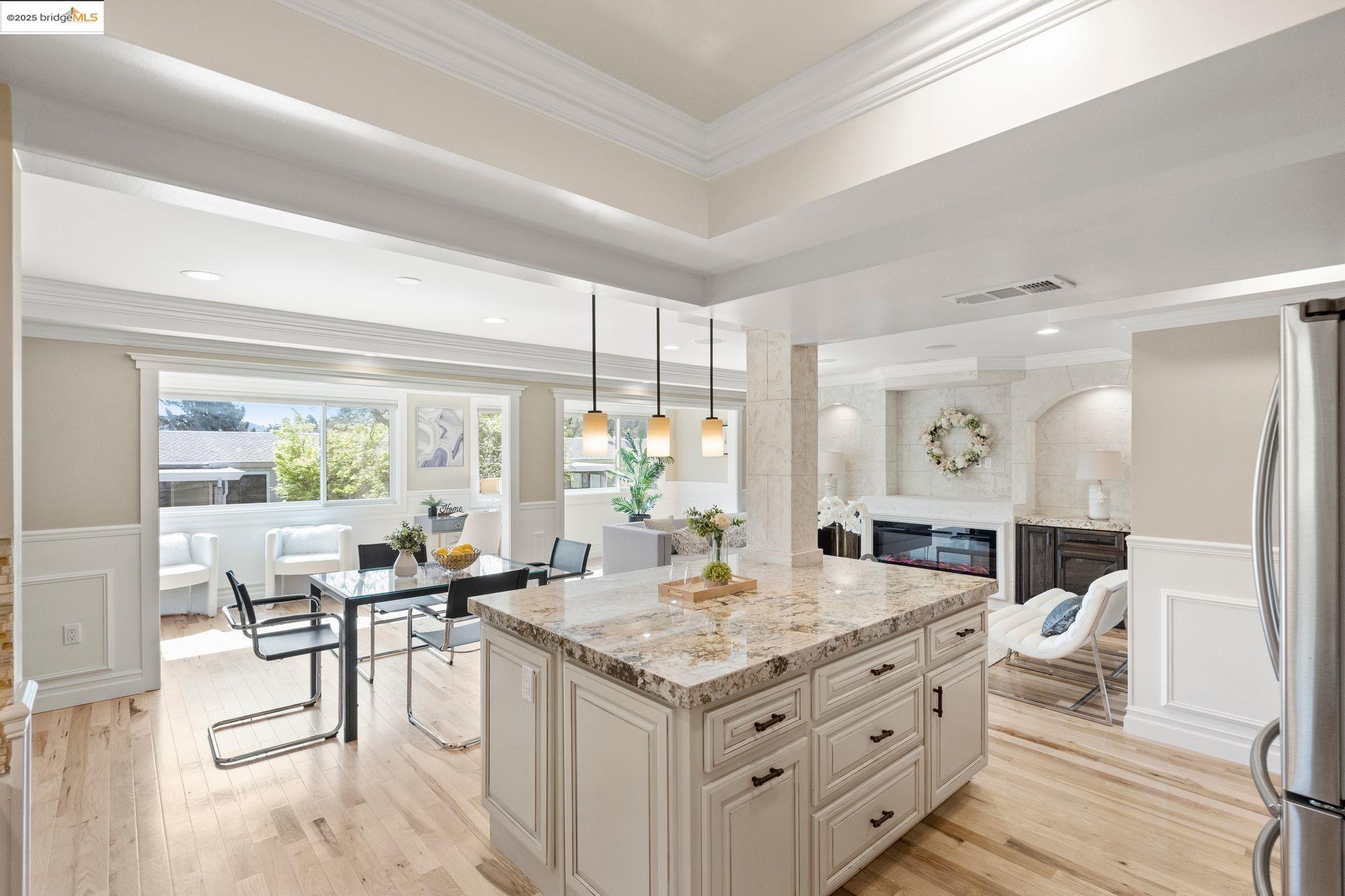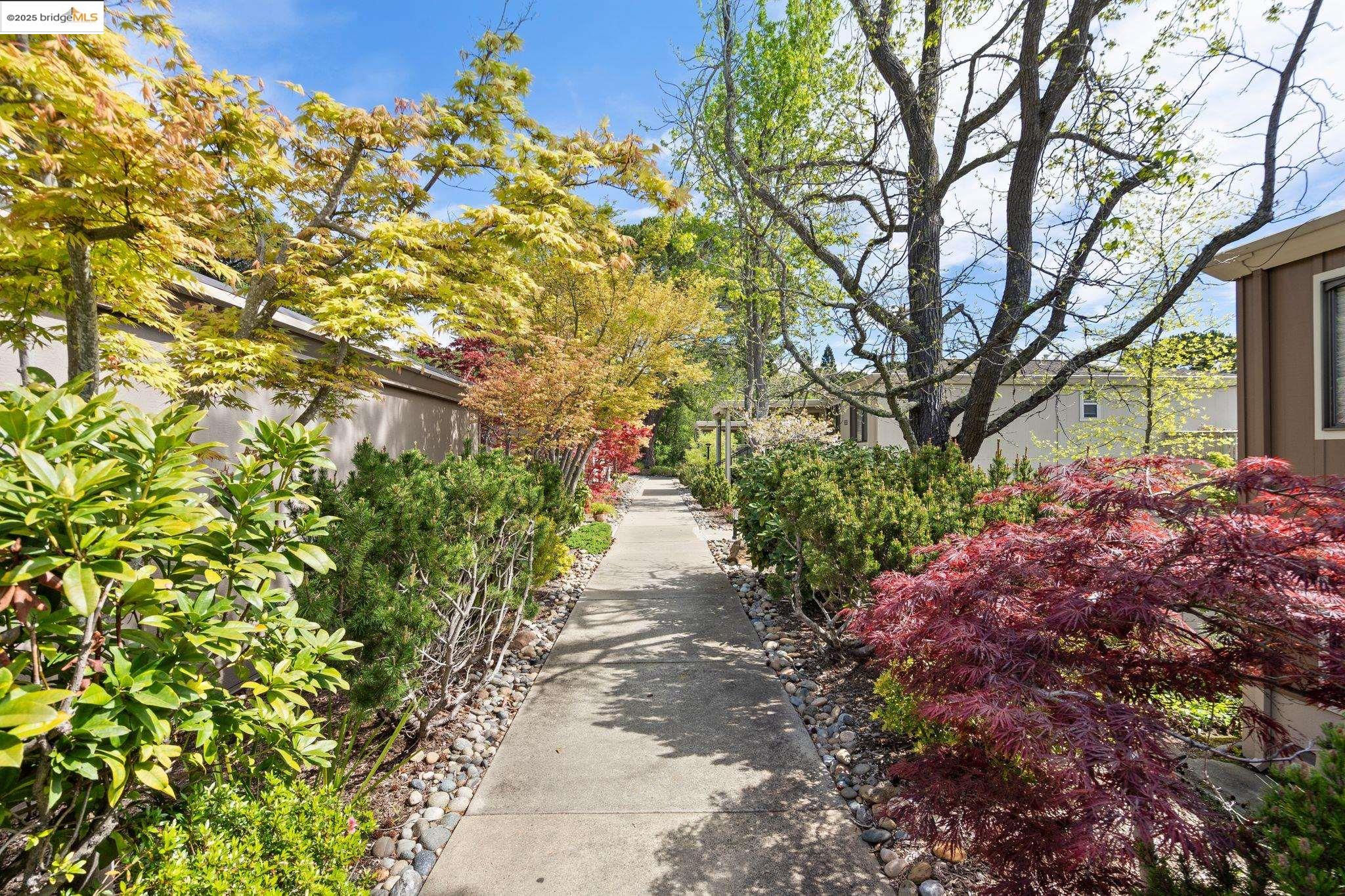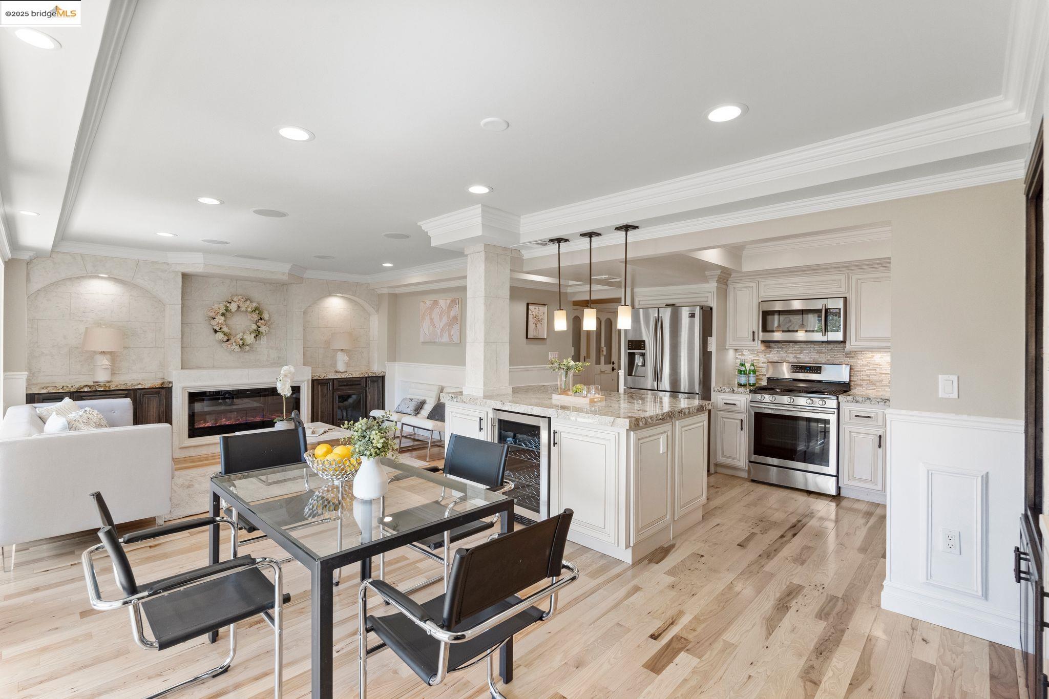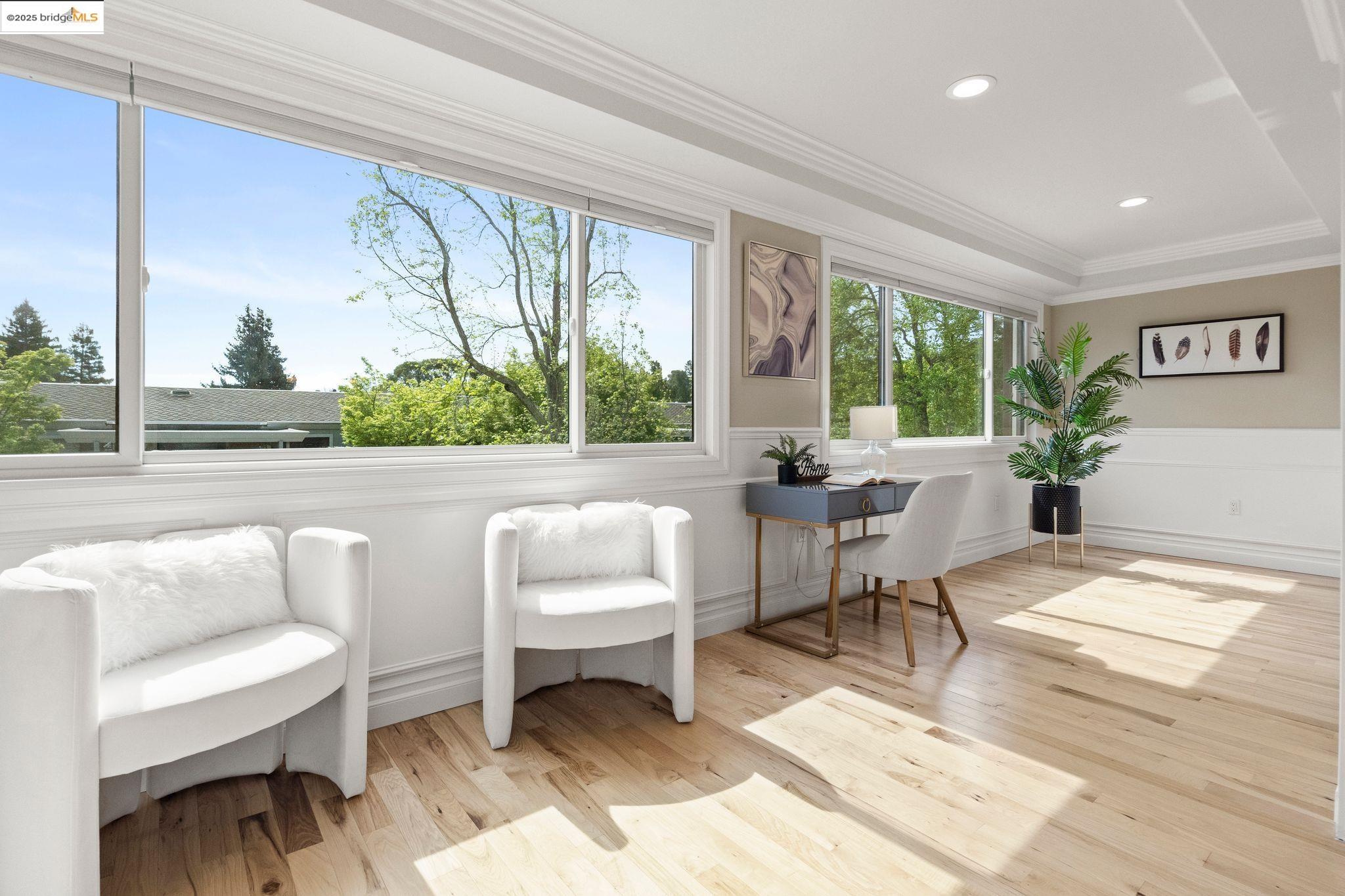 Experience luxury living in the "Sonoma wrap" model at Rossmoor, a modern home offering 1,400 sq. ft. of exquisite space. The entire home features beautiful wood floors, creating a warm ambiance, while the chef's kitchen boasts a gas stove, custom cabinetry, Samsung appliances, and a wine fridge. Recessed lighting highlights elegant crown molding, with ample storage throughout. The cozy living area includes an electric fireplace and built-in cabinets. Both bedrooms offer crown molding, wood floors, and plantation shutters for added elegance and privacy. Enjoy a separate office with a view of maple trees and two stylish full bathrooms with ceramic-tiled showers and tubs. As a private end unit, this home is perfectly positioned across from the Hillside Clubhouse, granting easy access to Rossmoor's amenities: golf, pools, gym, tennis, lawn bowling, pickleball, hiking, and more. Schedule a visit today to experience this luxurious lifestyle!