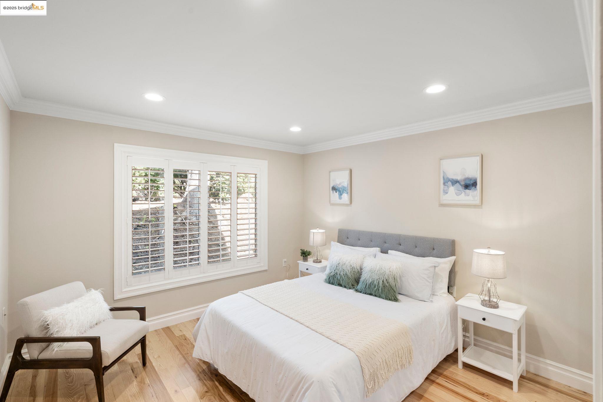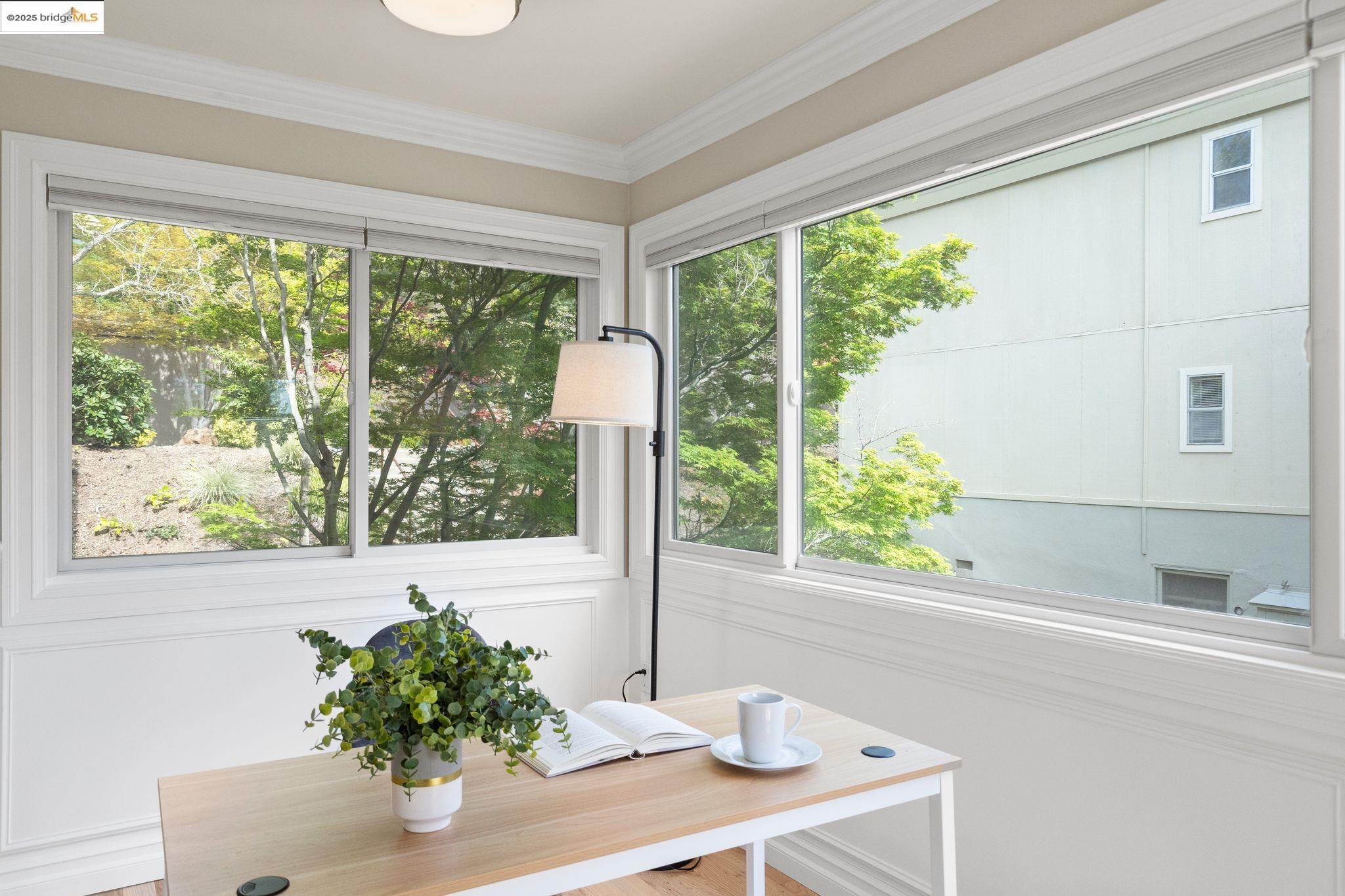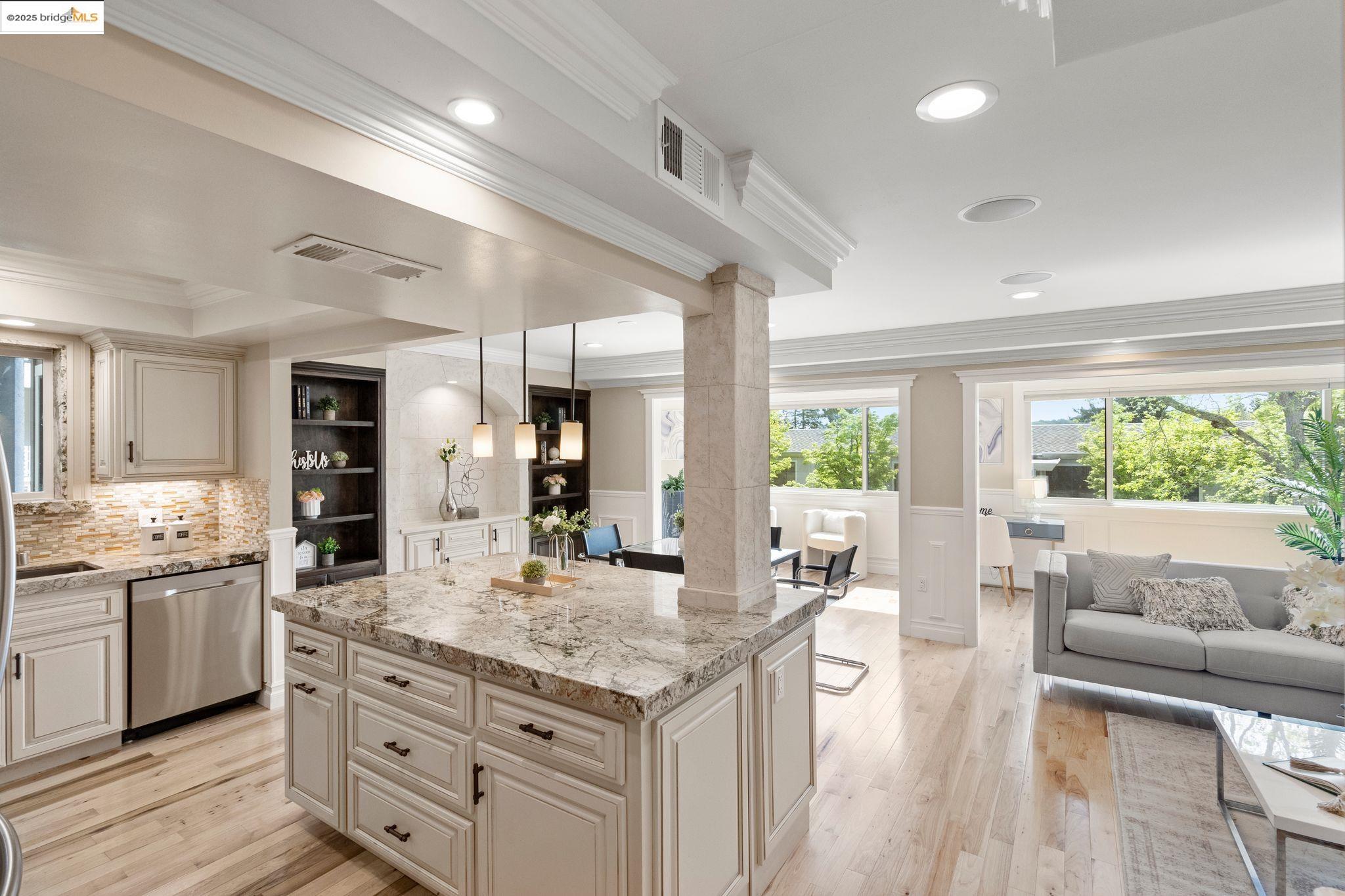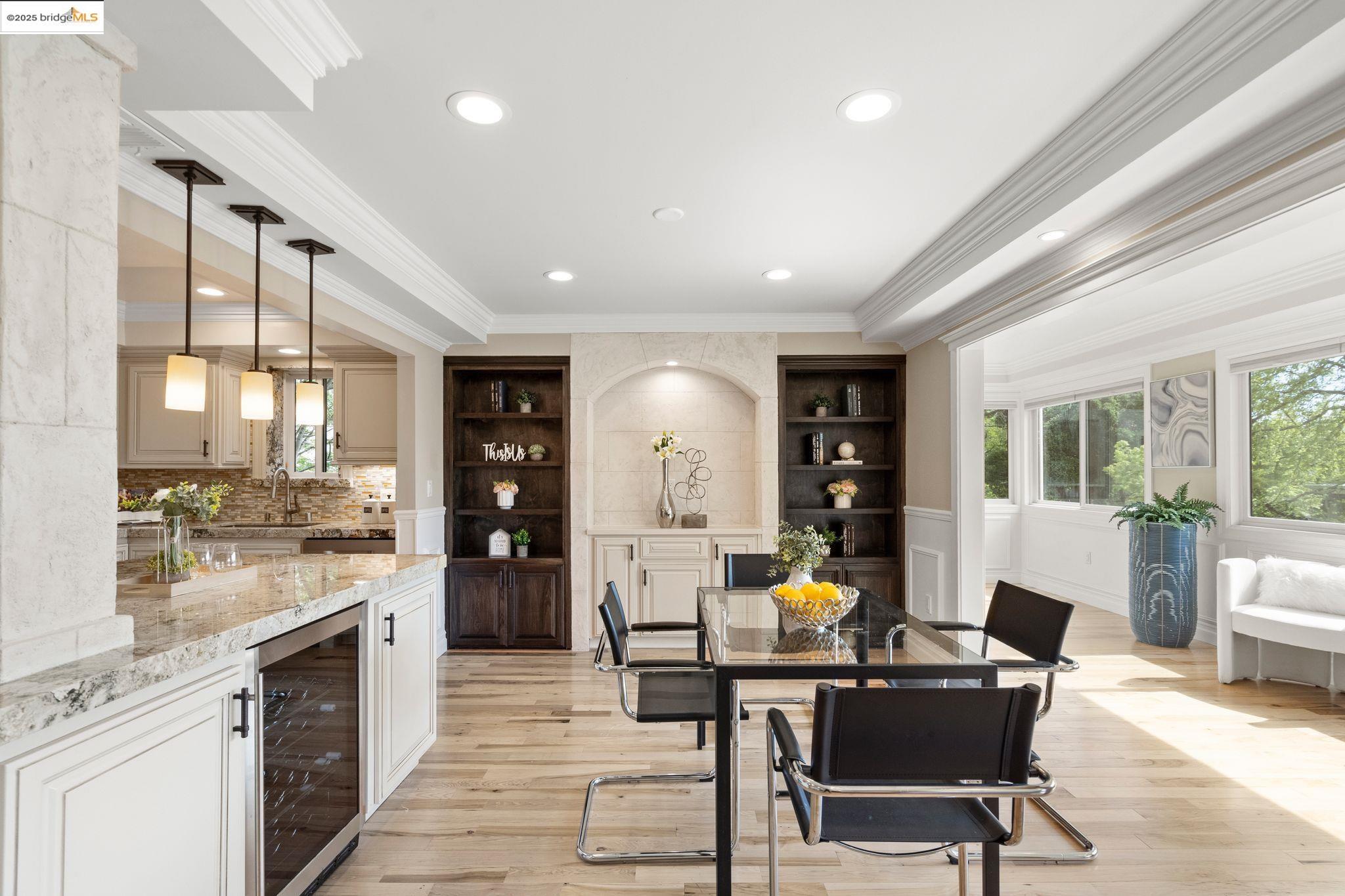 Experience luxury living in the "Sonoma wrap" model at Rossmoor, a modern home offering 1,400 sq. ft. of exquisite space. The entire home features beautiful wood floors, creating a warm ambiance, while the chef's kitchen boasts a gas stove, custom cabinetry, Samsung appliances, and a wine fridge. Recessed lighting highlights elegant crown molding, with ample storage throughout. The cozy living area includes an electric fireplace and built-in cabinets. Both bedrooms offer crown molding, wood floors, and plantation shutters for added elegance and privacy. Enjoy a separate office with a view of maple trees and two stylish full bathrooms with ceramic-tiled showers and tubs. As a private end unit, this home is perfectly positioned across from the Hillside Clubhouse, granting easy access to Rossmoor's amenities: golf, pools, gym, tennis, lawn bowling, pickleball, hiking, and more. Schedule a visit today to experience this luxurious lifestyle!