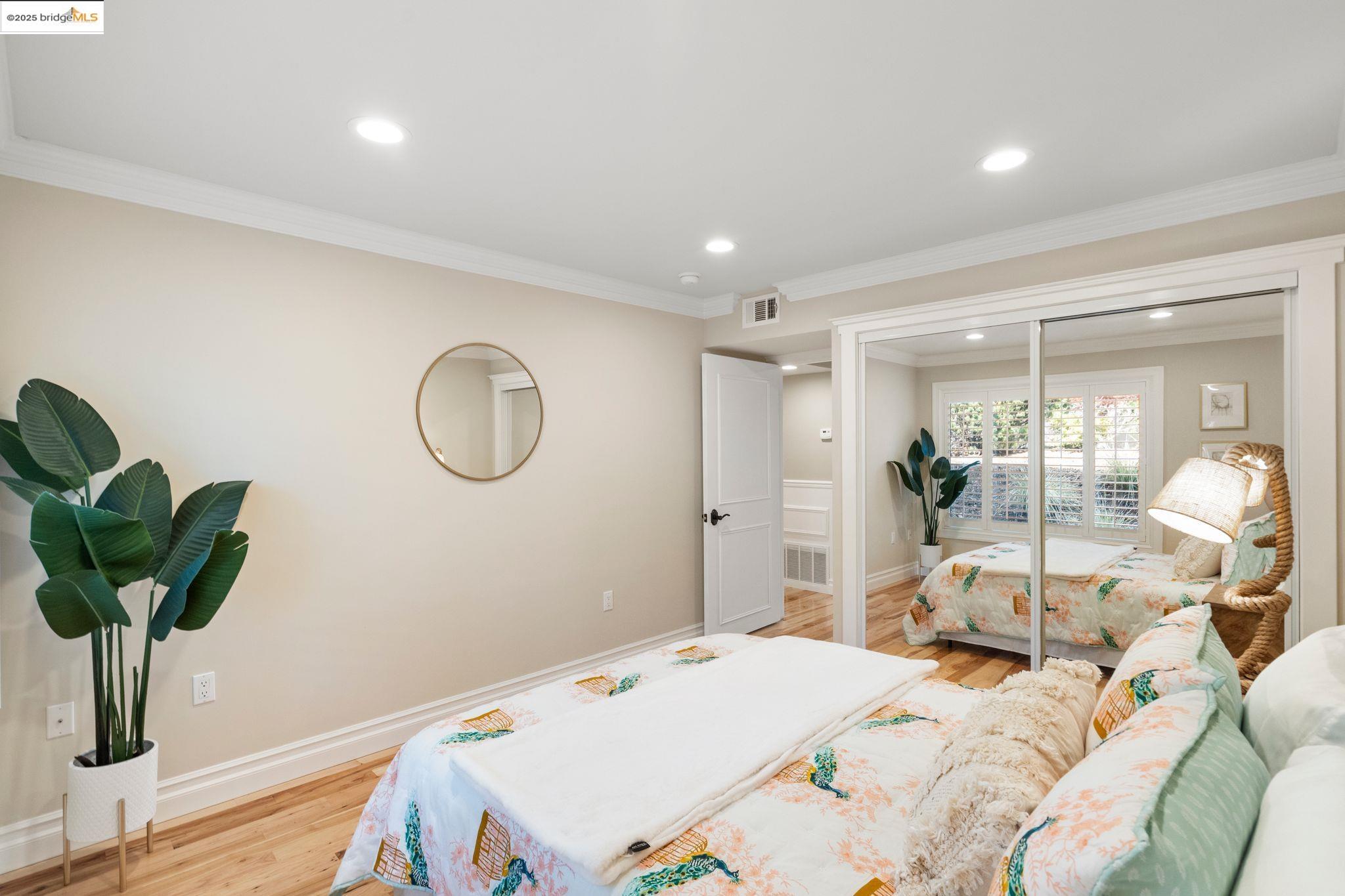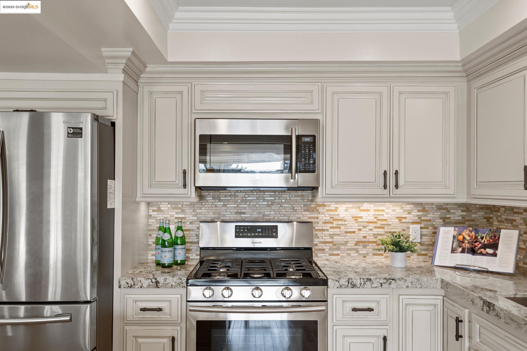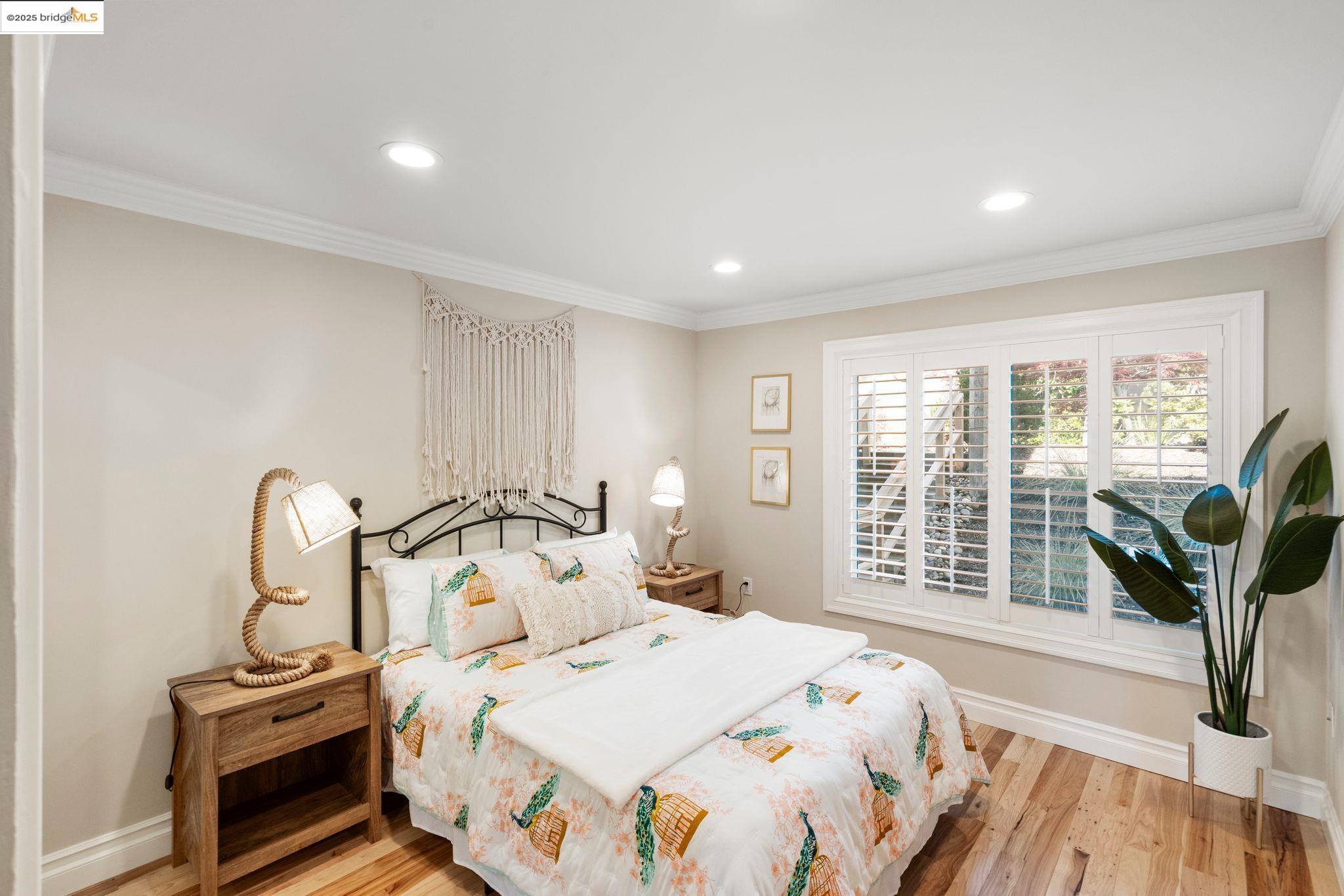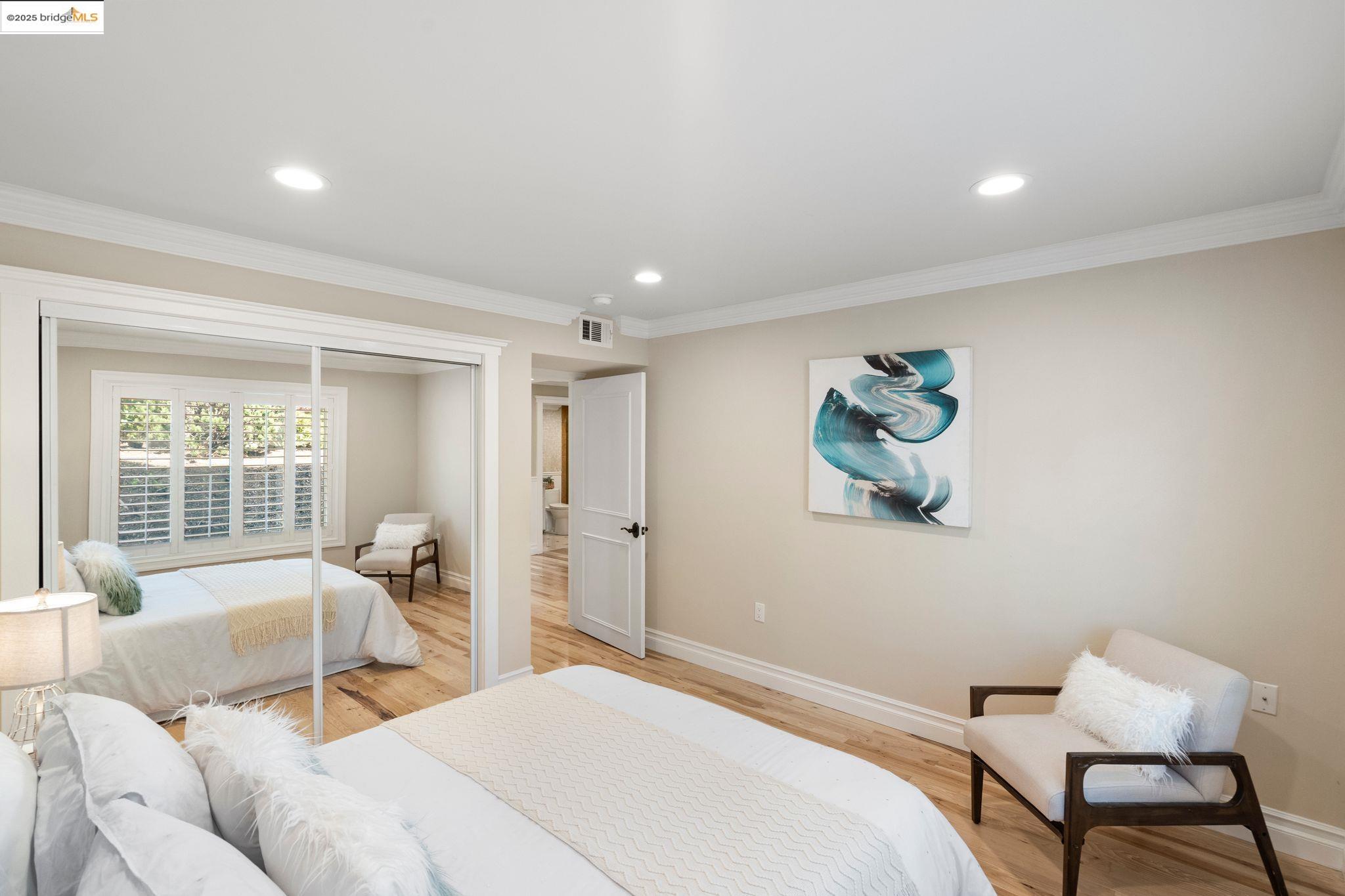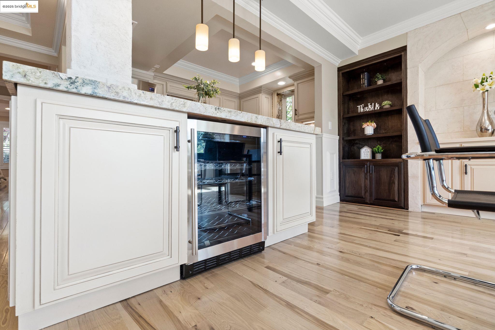 Experience luxury living in the "Sonoma wrap" model at Rossmoor, a modern home offering 1,400 sq. ft. of exquisite space. The entire home features beautiful wood floors, creating a warm ambiance, while the chef's kitchen boasts a gas stove, custom cabinetry, Samsung appliances, and a wine fridge. Recessed lighting highlights elegant crown molding, with ample storage throughout. The cozy living area includes an electric fireplace and built-in cabinets. Both bedrooms offer crown molding, wood floors, and plantation shutters for added elegance and privacy. Enjoy a separate office with a view of maple trees and two stylish full bathrooms with ceramic-tiled showers and tubs. As a private end unit, this home is perfectly positioned across from the Hillside Clubhouse, granting easy access to Rossmoor's amenities: golf, pools, gym, tennis, lawn bowling, pickleball, hiking, and more. Schedule a visit today to experience this luxurious lifestyle!